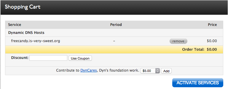 | 6. Once you've got your settings in place, you're ready to hit Activate. If you have other products in your shopping cart, this button will appear as Add To Cart; your new hostname will be added as a $0.00 item to your cart, as you must go through the checkout to activate the new host. | ![]() ![]() |