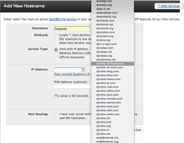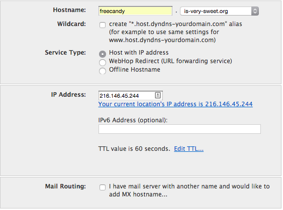 Dynamic DNS gives you the flexibility of setting up your new hostname for mail routing. You also have the ability to select a custom TTL (Time To Live) value for your hostname, in the event that your use case requires it.