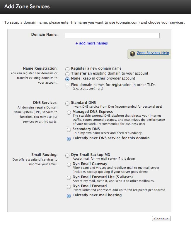 Dyn Standard DNS zones are created on a per-instance basis. You will purchase Dyn Standard DNS for each domain name you wish to have served by Dyn Standard DNS. The following steps will guide you through the purchasing process for Dyn Standard DNS.