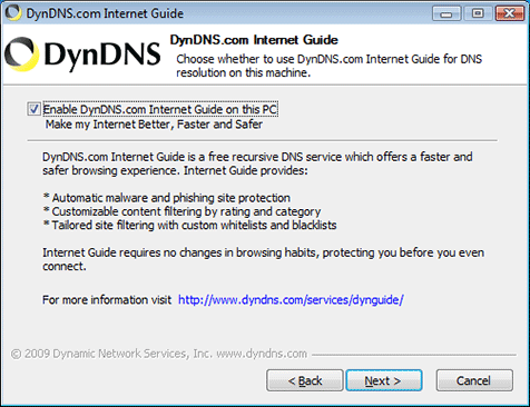 Select whether you wish to enable Internet Guide, our free recursive DNS service which offers phishing and malware protection as well as customizable content filtering. (You may disable the service at any time by unchecking the "Enable Internet Guide" field on the Advanced tab of the update client.)
