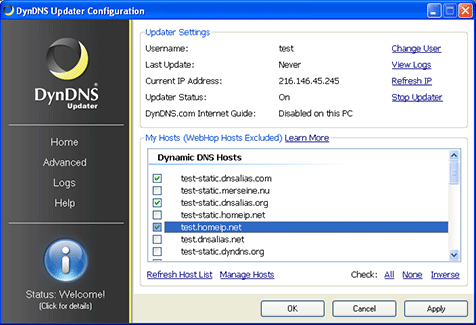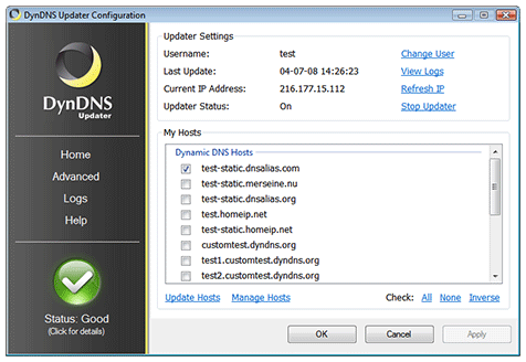 If you've entered your username and password correctly, the Dyn Updater will automatically download a list of hosts from your account. From this list, you may check which hosts you'd like to keep up-to-date with your computer's IP address. You may check up to 20 hosts.