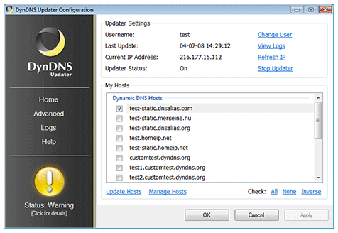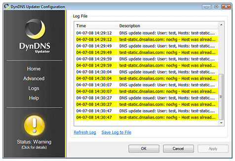 A yellow (Warning) status indicates that the Updater needs your attention. Typically, you will receive a Warning if the Updater has submitted the same IP address multiple times within a period of 2 days. To reduce load, Dyn requests that you only update your hostnames if their IP addresses change. The Dyn Updater does its best to adhere to this rule, but if you submit the same IP address more than twice in a row, you will receive this status in the Dyn Updater. If this occurs only once, it is generally not an issue. However, if you see multiple Warning messages in your Logs, you should determine the problem immediately, otherwise your account may be blocked due to abuse.