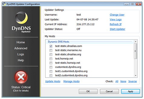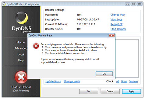 A red (Critical) status indicates that the Dyn Updater has received an unrecoverable error. This status requires immediate user attention. Some causes for a Critical status are: