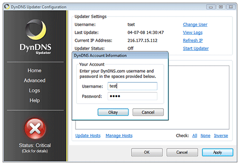 Figure 9: Dyn Updater requires your Dyn username and password.