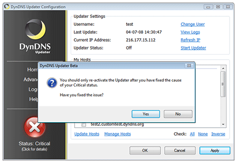 After you have fixed your problem, you can either click the Critical status icon, or simply click Start Updater to begin updating again. In the example below, we've clicked the status icon, which asks us to confirm that we've fixed the problem. Click Yes if you have.