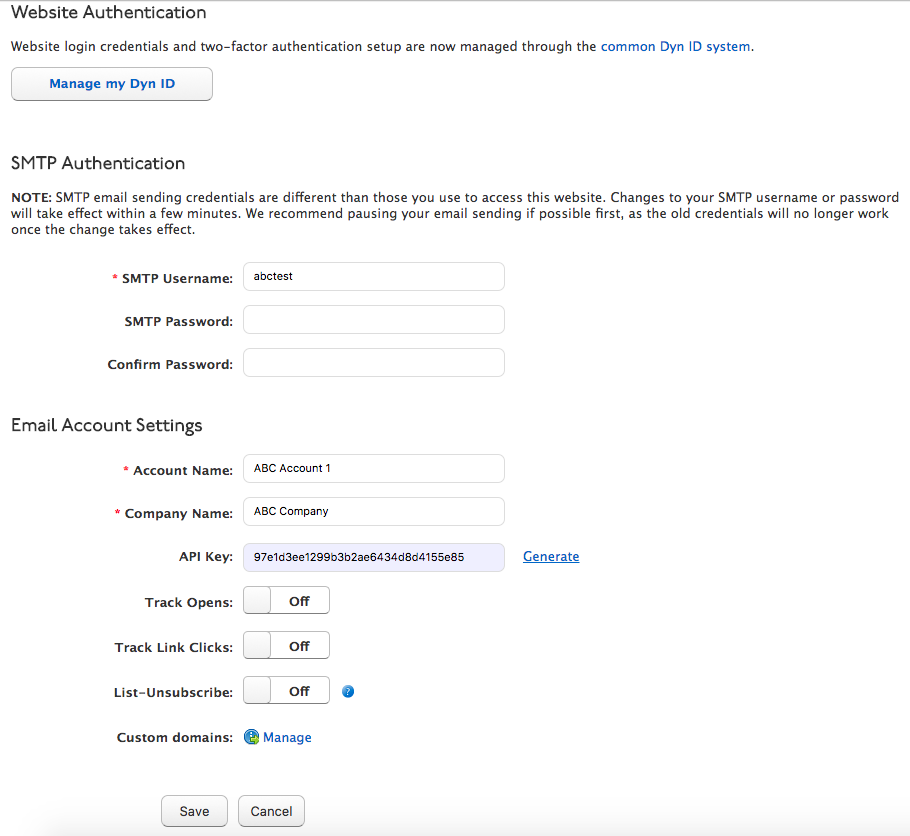 3. Complete your edits of the Account Information page for the account.Note: If you want to change the username of a master account, you need to: (1) Choose a unique email address that is currently not used by any account at Dyn. A popup alert box will notify you if the email address you choose is already in use. (2) Make sure that the pipe [|] character is not in the email addresses. Once you change the master account username, the account will no longer be able to send emails using the old master account username. It may take up to 20 minutes before the new master account username can send emails after this change. |  |