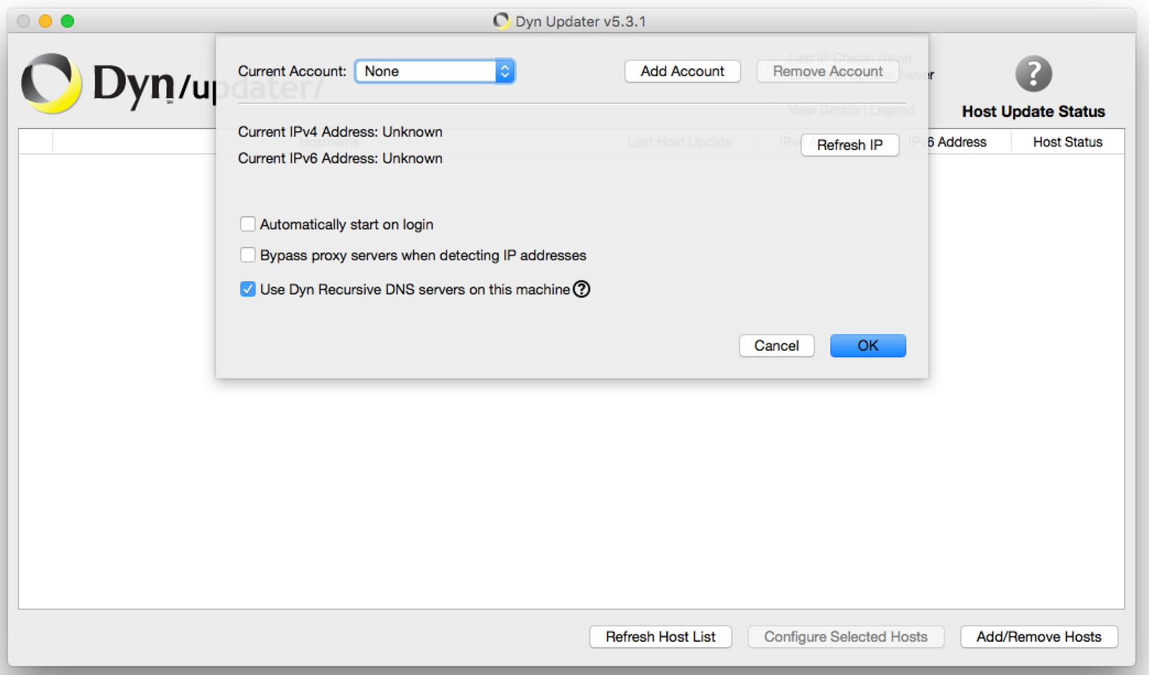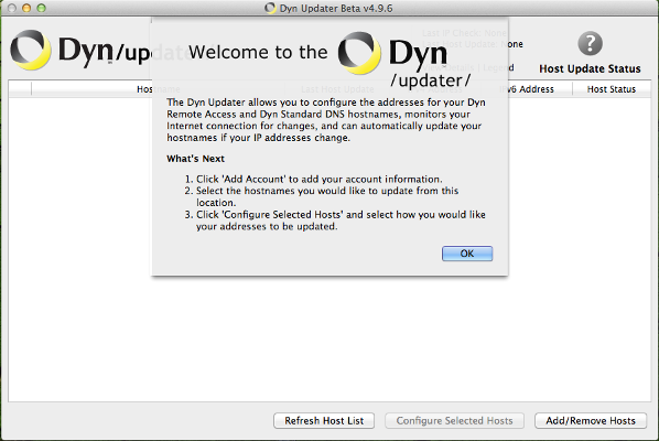 The first time you open the Dyn Updater after installing it, you'll be presented with a Welcome dialog followed by the Preferences dialog. Click OK in the Welcome dialog after reading it.