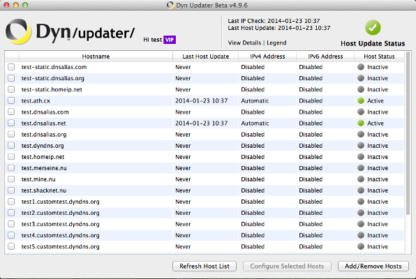 Once you click OK, an update will be sent with your new settings and if all goes well, you'll get a good status like below. If you get something other than a green 'good' status, click on the Legend inside the client to see what it means. You can quickly see which hosts are configured to be updated in your client by looking at the Host Status column to the right of each host. Hosts that are being monitored for IP changes have the green Active icon.