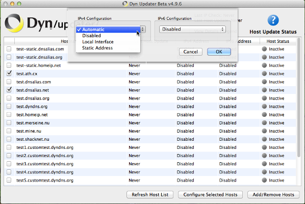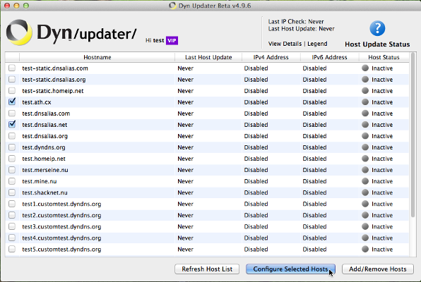 You should now see all of your hosts that exist in your account, but they are not being automatically updated yet. You should select which hosts you would like to update by clicking the check boxes to their left, then clicking on the Configure Selected Hosts button. Since you can update hostnames in different ways (more on that below), you can have different hosts set to update differently all within the same Update client.