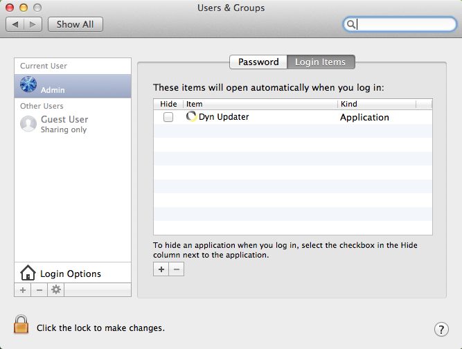 You'll generally want the Dyn Updater to start up with your computer, so you'll need to add it to your login items. You can do this by going to your System Settings, then clicking Users & Groups, then by clicking on the Login Items tab. Click the + and add the Dyn Updater. You may need to click the lock icon to unlock configuration first.