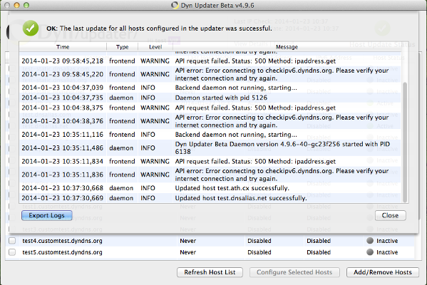 In the example below, the Updater was unable to determine an IPv6 address for the computer, but updates were successfully sent as none of the hostnames were configured to include IPv6 support. This is a common warning as many internet service providers have not yet made IPv6 available to customers, and can be safely ignored so long as the hosts were updated successfully.