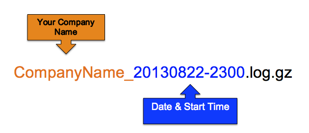 The first set of characters in the file name is your company name, followed by an underscore. The following 13 characters of the file name is the 8-digit date in YYYYMMDD format, followed by a dash, followed by 4 characters representing the UTC timestamp at the start of the time period.