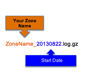 Dyn can setup your account to sort the log files on a per zone basis instead of having all zones in one log file. Please contact your Dyn representative to setup your log files to be separated by zone. Once your account is setup to separate the files by zone, the file name will be in the per-zone query log format.